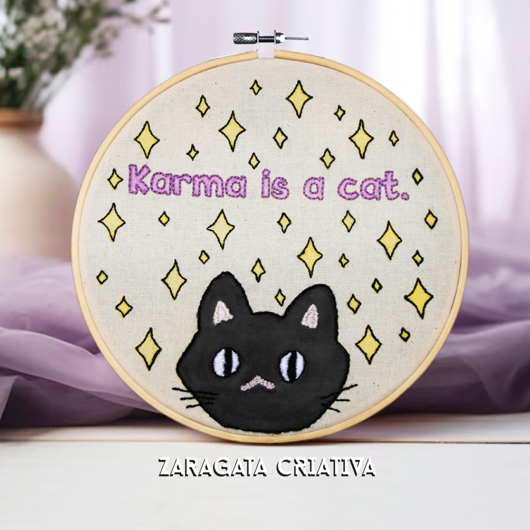 Bordado num bastidor com um gato preto e texto 'Karma is a cat.'