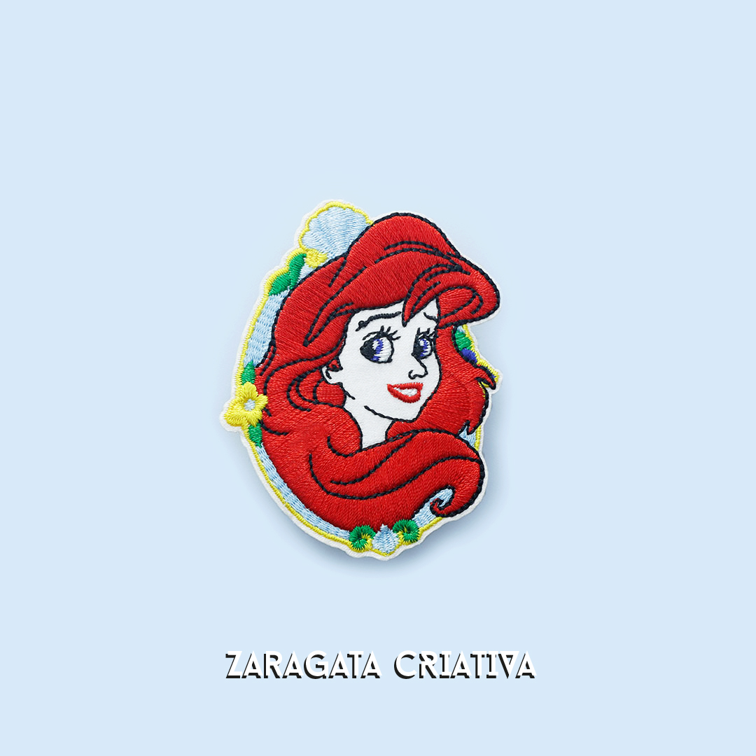 • Aplicação bordada da personagem Ariel com cabelo vermelho e flores