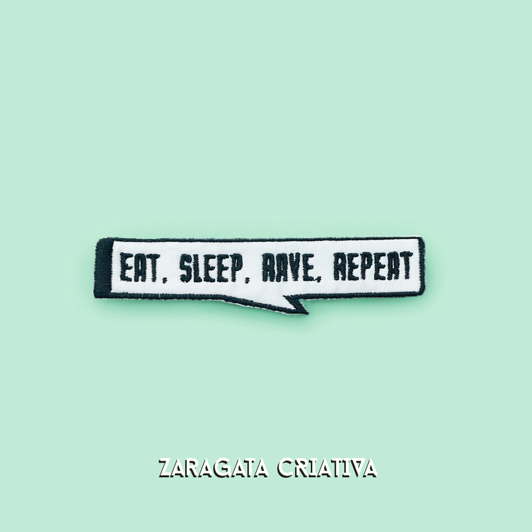 Apresentamos o Emblema Bordado "Eat, Sleep, Rave, Repeat" - o artigo perfeito para expressar a essência da vida acadêmica.