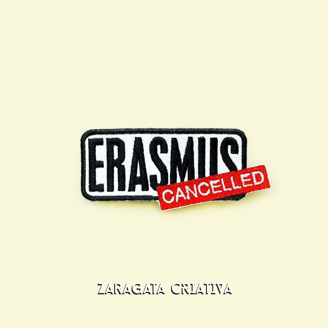 Apresentamos o Emblema Bordado Erasmus Cancelled, um acessório exclusivo para aqueles que tiveram os planos de Erasmus cancelados.