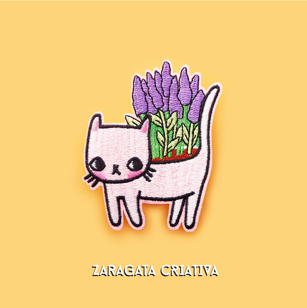 Apresentamos o nosso emblema bordado de gato lavanda, perfeito para os amantes de gatos e natureza.