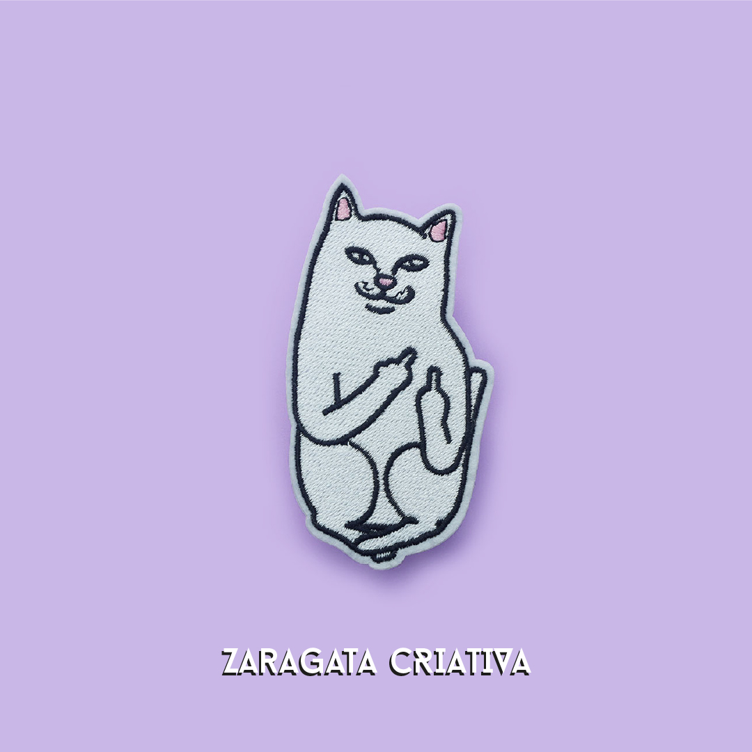 • Distintivo bordado de gato branco a mostrar os dedos do meio, sobre fundo lilás com texto Zaragata Criativa