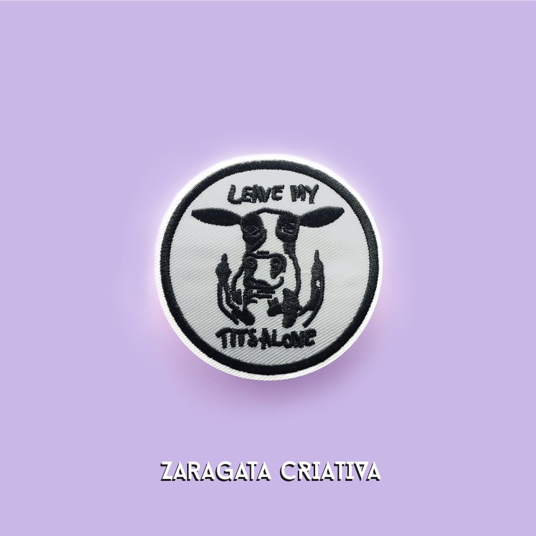 • Emblema redondo branco e preto com desenho de vaca e texto 'LEAVE MY TITS ALONE' num fundo lilás