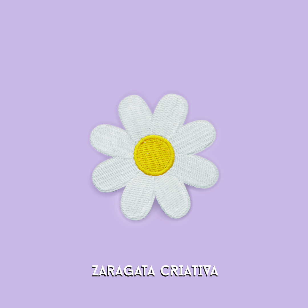 • Patch bordado flor branca com centro amarelo no fundo lilás e texto ZARAGATA CRIATIVA