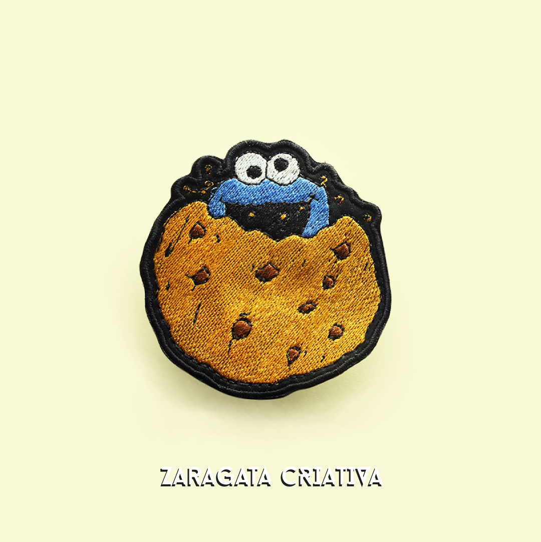 • Emblema bordado de personagem azul a sair de um biscoito amarelo com pedaços castanhos