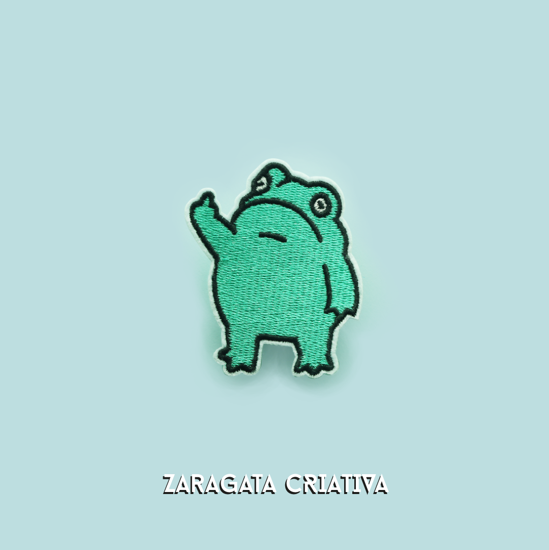 • Insígnia bordada rã verde com texto ZARAGATA CRIATIVA