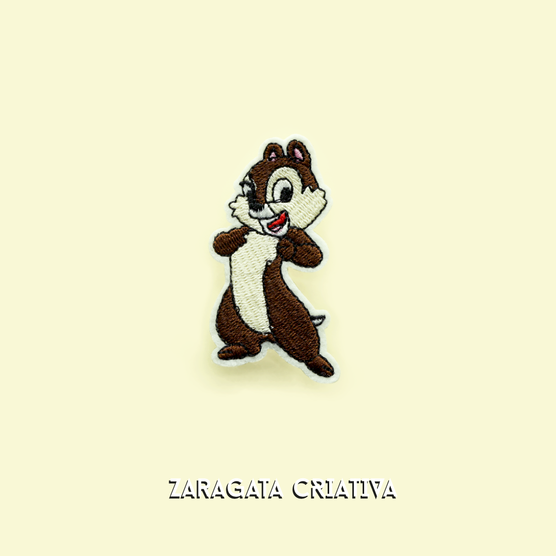 • Bordado de esquilo sorridente com texto ZARAGATA CRIATIVA no fundo amarelo claro