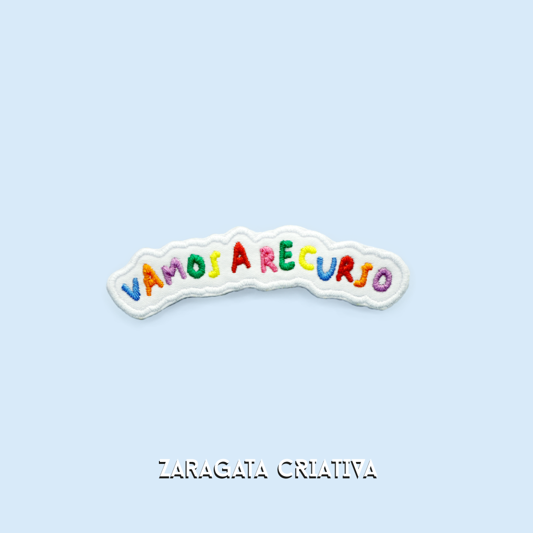 • Aplicação em tecido com letras coloridas VAMOS A RECURSO sobre fundo azul claro