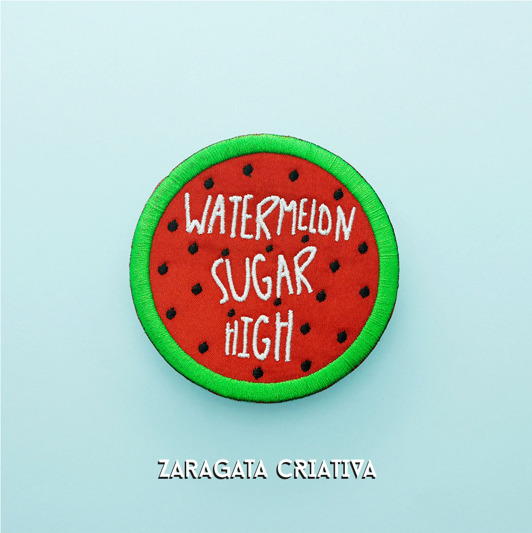 • Aplicação redonda de tecido com design de melancia e texto 'WATERMELON SUGAR HIGH'