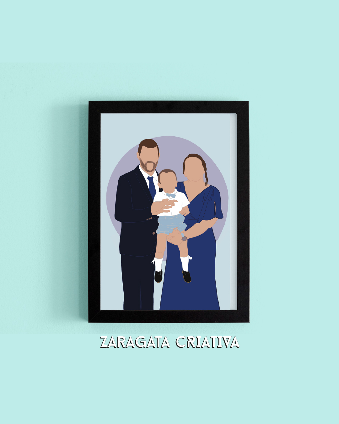 • Moldura preta com ilustração digital de família contra parede azul e texto ZARAGATA CRIATIVA