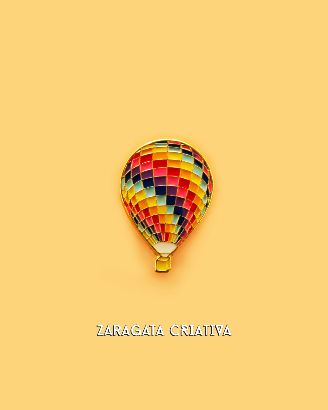 Balão de ar quente colorido com padrão quadriculado em fundo amarelo com texto 'ZARAGATA CRIATIVA'