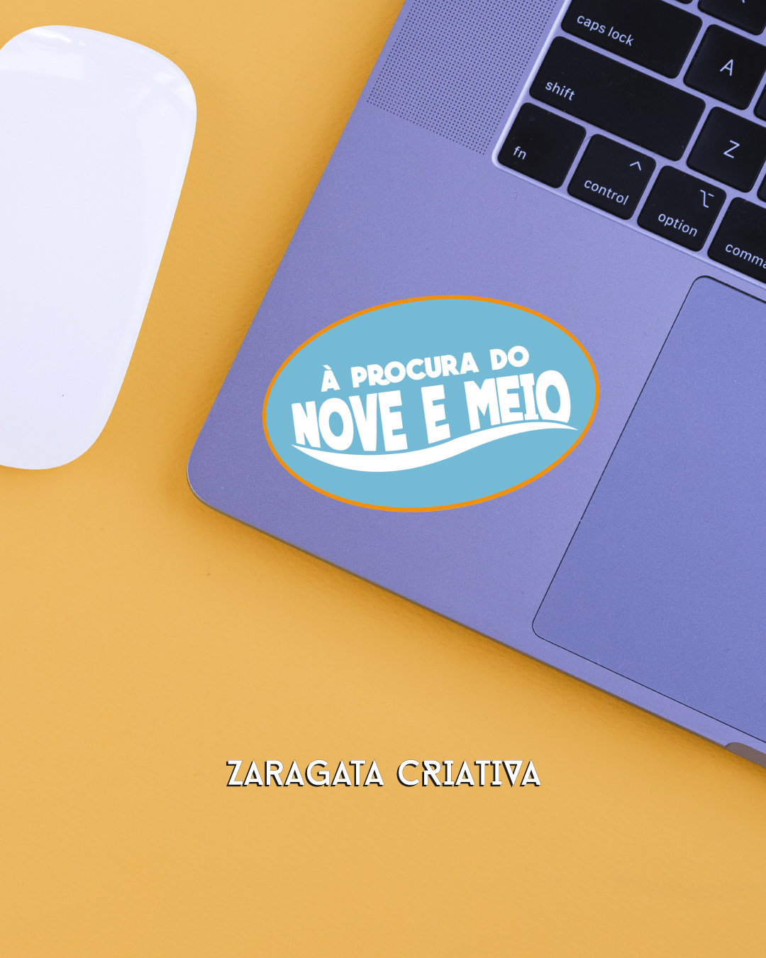 • Computador portátil com autocolante azul e rato branco numa superfície amarela